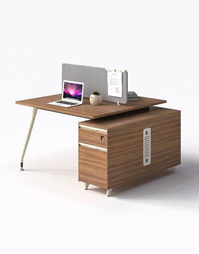 Bàn nhân viên 1.4m kèm tủ, kiểu chân 1908, chân ống Ø 50 tóp côn có gối nhôm chuyển tiếp, liên kết với thanh giằng hộp 25x50. Phần sắt sơn tĩnh điện màu đen hoặc kem.