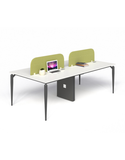 Chất liệu: Bàn nhân viên cụm 4 có hộp kỹ thuật ốp gỗ, chân sắt ống chỏm cầu tóp côn sơn đen sần hoặc kem, thanh giằng hộp 25x50. Mặt bàn gỗ MFC dày 25mm chống xước, chống cong vênh, mối mọt. Bền bỉ theo thời gian.