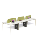 Chất liệu: Bàn nhân viên cụm 6 có hộp kỹ thuật ốp gỗ, chân sắt ống chỏm cầu tóp côn sơn đen sần hoặc kem, thanh giằng hộp 25x50. Mặt bàn gỗ MFC dày 25mm chống xước, chống cong vênh, mối mọt. Bền bỉ theo thời gian.