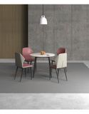Chất liệu: Bàn ăn mặt tròn, chân làm từ chân ống Ø 50 tóp côn. Khung đỡ mặt bàn bằng thép hộp 25x50, sơn đen sần hoặc kem. Mặt bàn bằng đá ceramic dày 12mm. Chỉ có màu trắng vân.