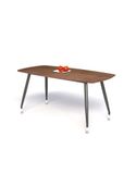 Chất liệu: Bàn ăn chân sắt ống Ø50 tóp côn, liên kết với chân tăng chỉnh mạ Niken bằng khớp nối nhôm hợp kim cao 5cm. Khung đỡ mặt bàn bằng thép hộp 25x50, sơn đen sần hoặc kem. Mặt bàn cốt gỗ plywood dày 18mm phủ melamin 2 mặt. Cạnh bàn vát chéo.