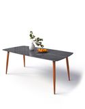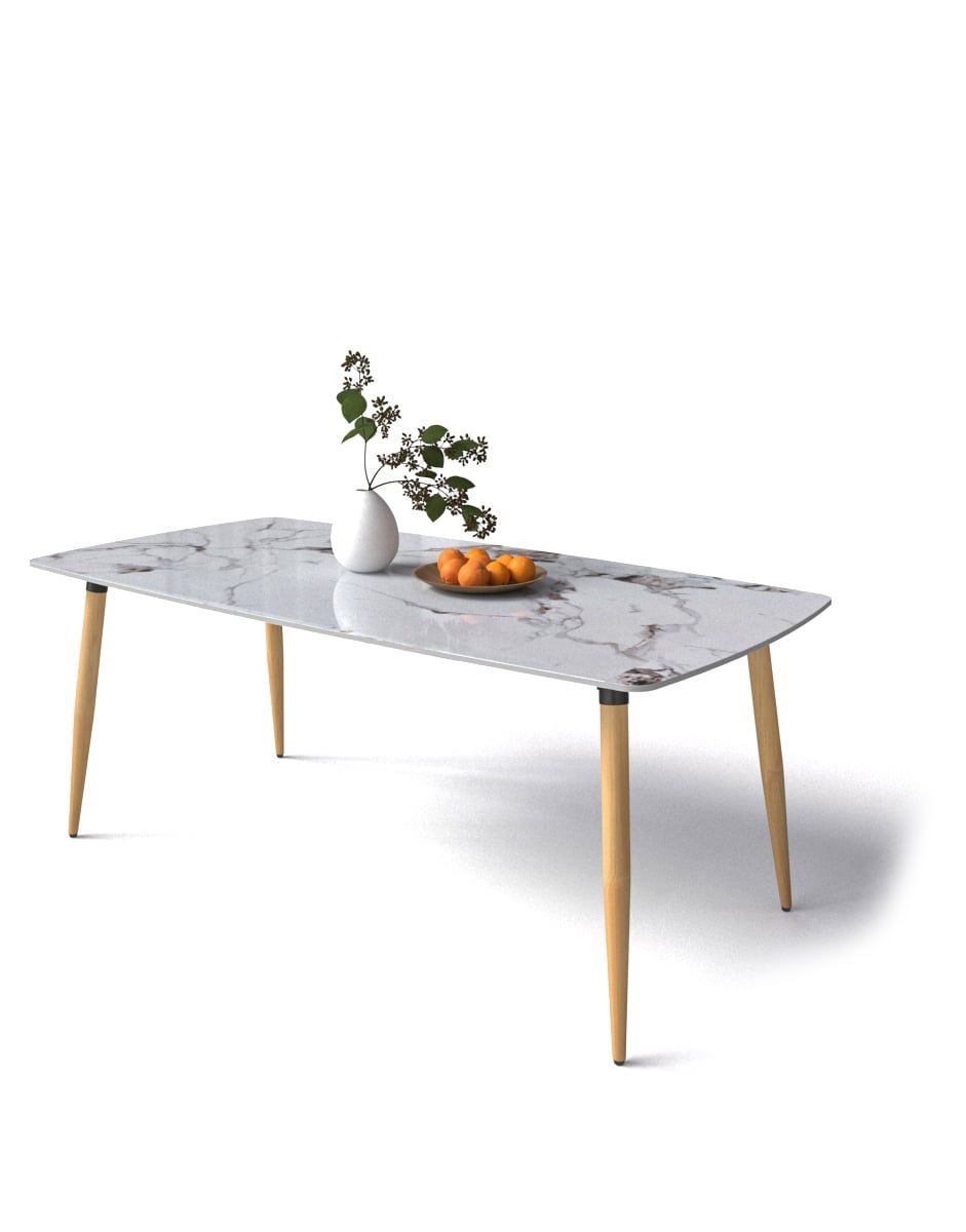 Chất liệu: Bàn ăn chân gỗ cao su sơn màu nâu cánh dán hoặc vàng tự nhiên, khung giằng thép hộp 25x50 sơn tĩnh điện màu đen sần. Mặt đá ceramic dày 12mm.
