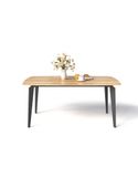 Chất liệu: Bàn ăn chân sắt tạo hình kiểu thanh cài bút, sơn đen sần hoặc kem. Mặt bàn gỗ cao su ghép thanh dày 20mm. Có 2 màu sơn gỗ: nâu cánh gián và vàng tự nhiên.