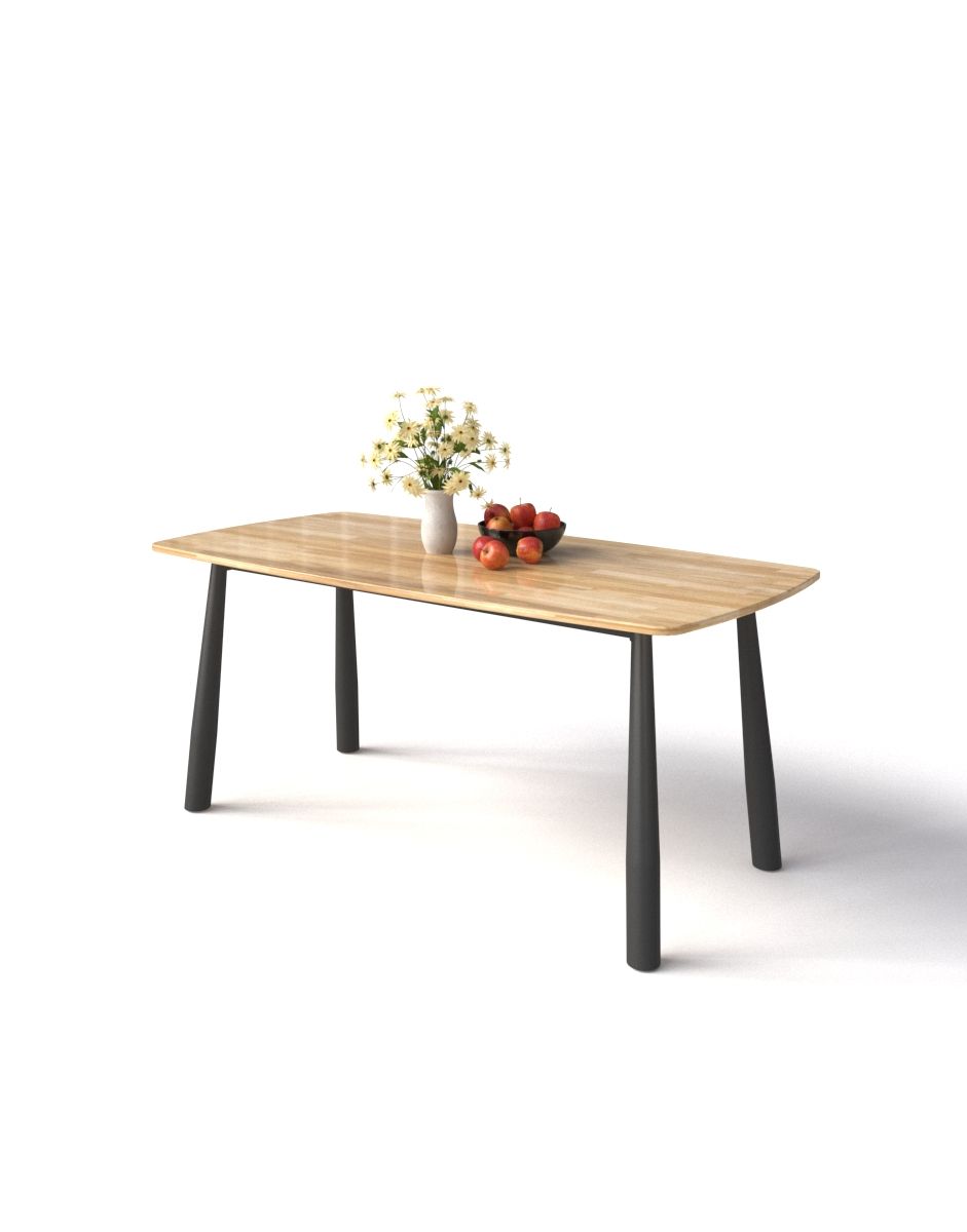 Chất liệu: Bàn ăn chân sắt kiểu gậy bóng chày, sơn đen sần hoặc kem. Mặt bàn gỗ cao su ghép thanh dày 20mm. Có 2 màu sơn gỗ: nâu cánh gián và vàng tự nhiên.