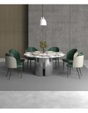 Chất liệu: Bàn ăn mặt tròn xoay bằng đá ceramic màu trắng vân dày 12mm, phần dưới Ø 1500, phần trên Ø900, chân làm từ inox tấm dập ép tạo hình trăng khuyết màu đen bóng