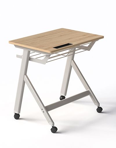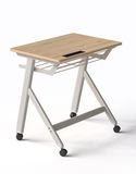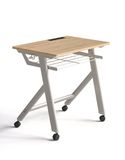 Chất liệu: Mặt gỗ MFC dày 17. Khung thép sơn tĩnh điện ghi nhũ, có ngăn bàn để sách và móc treo cặp và khay bút, có 4 bánh xe có hãm.