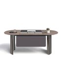 Chất liệu: Bàn lãnh đạo, mặt bàn gỗ MFC 2 lớp, lớp trên dày 17mm cạnh vát chéo có ghép tấm da ở giữa, lớp dưới dày 25mm. Chân làm từ inox tấm màu đen bóng dập ép tạo hình trăng khuyết. Yếm bàn làm từ khung sắt bọc da. Có máng điện và ổ điện.