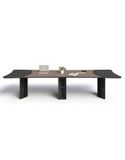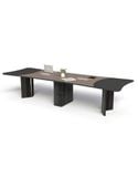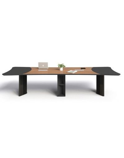 Bàn 261BH36 thuộc dòng bàn họp có chân sắt mạ giả inox màu đen bóng được dập hộp tạo hình có phối gỗ laminate màu vân gỗ, có hộc tủ gỗ ở giữa làm chân bàn, thanh giằng thép hộp. Mặt bàn gỗ MFC 2 lớp, lớp trên dày 17mm, lớp dưới dày 17mm cạnh vát chéo kèm 2 nắp nhôm lật 2 chiều