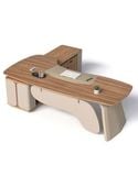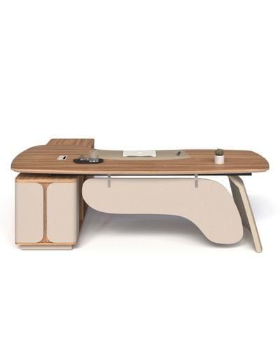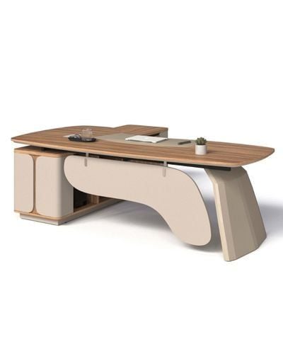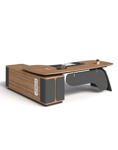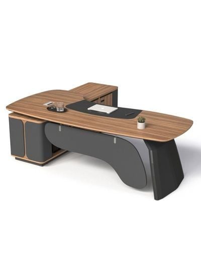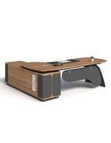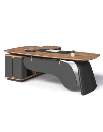 Bàn 262BLD24 thuộc dòng Bàn lãnh đạo có tủ phụ, mặt bàn gỗ MFC 2 lớp, lớp trên dày 17mm có ghép tấm da ở giữa, lớp dưới dày 17mm cạnh vát chéo. Chân bằng thép tạo hình cánh quạt sơn tĩnh điện màu đen/ vàng cát. Yếm bàn gỗ. Có 1 nắp nhôm luồn dây điện.