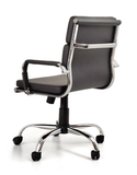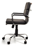 Chất liệu | Ghế xoay lưng trung, khung mạ. Tay mạ bọc da. Lưng và mặt ngồi có đệm dày bọc da công nghiệp màu đen. Chân sao mạ D320/ hợp kim D325. |
